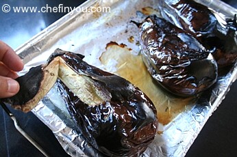 Traditionally large eggplants are placed on gas stove and burnt until scalded and smokey. It does take a bit of cleaning and work. Hence I use the oven to do my job, making cleaning a one stop shop process.  There is no mess and it gets done practically hands free (with a wee bit of turning in the middle)