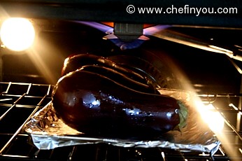 3. Place under a Broiler and broil until all the sides are blistered. Depending upon your oven and the eggplant it would roughly take around 20-30 minutes. Make sure to turn them every few minutes so that they get done on all sides.