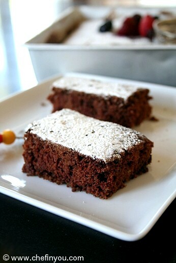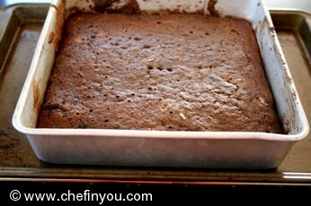 Immediately put pan in oven. Bake until toothpick inserted in center of cake comes out with a few moist crumbs attached, about 20-30 minutes depending upon your oven.Though it looks pretty dry in this photo, it was in fact deliciously moist!