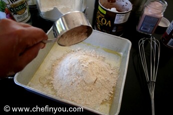 Adjust oven rack to middle position and heat oven to 350 degrees. Coat 8-inch-square baking pan with nonstick cooking spray. Add the flour, sugar, cocoa, baking soda, and salt together in the same pan.