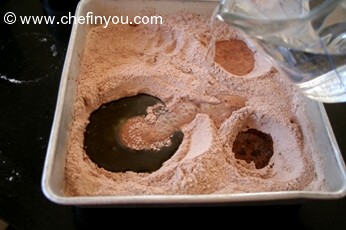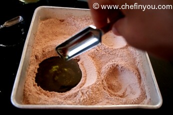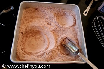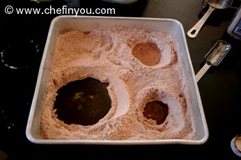 Make 1 large and 2 small craters in dry ingredients with a spoon. It need not be perfect.