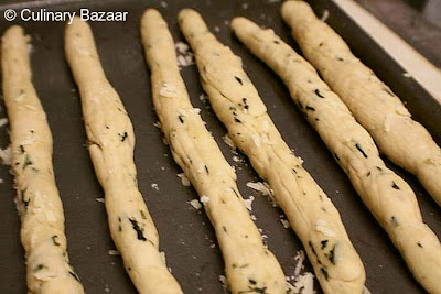 So next time you know you have "such" relatives coming, save yourself all the trouble, make stuff like Bread sticks little rustic looking and not "store" bought! The effort is not worth it - me thinks! :) :) This recipe was influenced by Pizza dough made with Basil and Parmesan by an acquaintance and I liked the taste to try the same in Grissini.