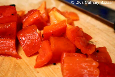 Roast the bell pepper till dark. Let it cool and peel the skin and cut into chunks. Set aside.