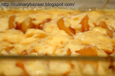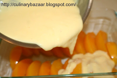 Pour the hot custard over the peach halves.