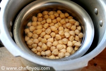 Drain and pressure cook it for 3-4 whistles - about 10 minutes. Use little water to cook the chickpeas - just enough to cover the chickpeas.