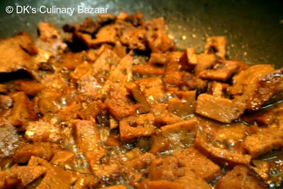 Then heat a pan and add the chopped seitan and stir fry for 4-5 min till golden brown. Then add the marinade till it covers it well and stir for another 2 min.