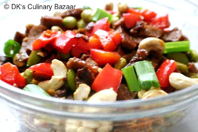 Once little soft, add the seitan and cashews, water and cook for 2-3 min more. If watery mix some soy flour and water and stir it with the dish for it to thicken