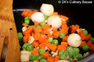 Saute the onions in a tbsp of butter ( /olive oil) till soft. Add carrots, garlic and peas and saute for 2-3 min more. Add salt to help them to cook faster.